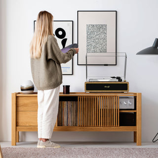 Features an Audio-Technica ATN-3600L cartridge for precise tracking and excellent sound fidelity. The adjustable counterweight and anti-skate mechanism ensure optimal stylus pressure and channel balance, reducing distortion and wear. Enhanced with soft LED ambient lighting, it not only delivers high-fidelity playback but also creates a warm, immersive atmosphere that elevates your listening space.