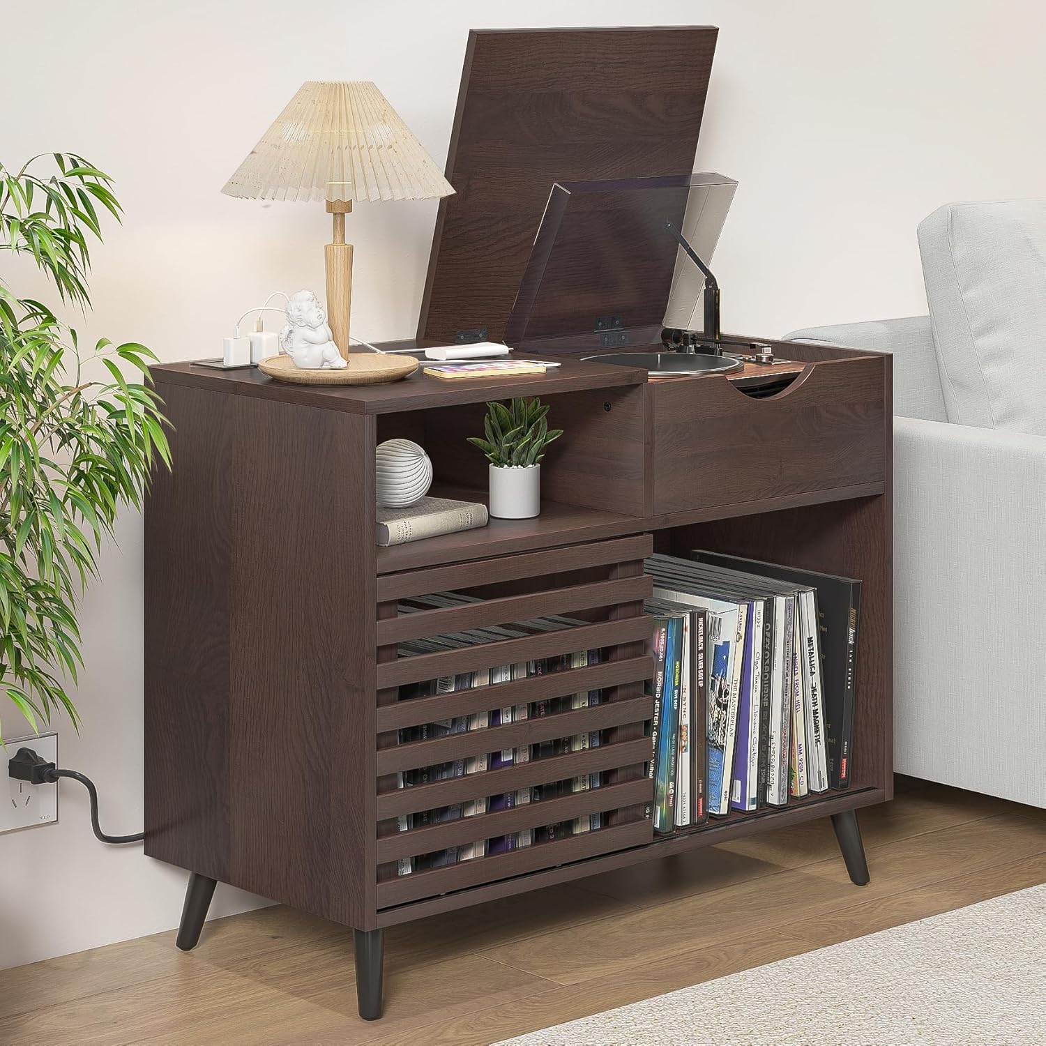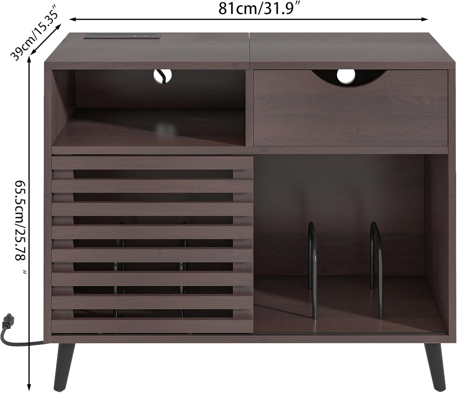 Add a touch of mid-century elegance and modern functionality to your home with this vintage-style record player stand. Featuring a built-in power socket, ample storage, and a solid wood construction, this stand blends classic aesthetics with everyday practicality. The open shelf design and sliding slatted door create a charming retro look, while the durable wood texture ensures stability and long-lasting use. Perfect for living rooms, dining rooms, or home offices, it provides the ideal space for your record player and music collection.