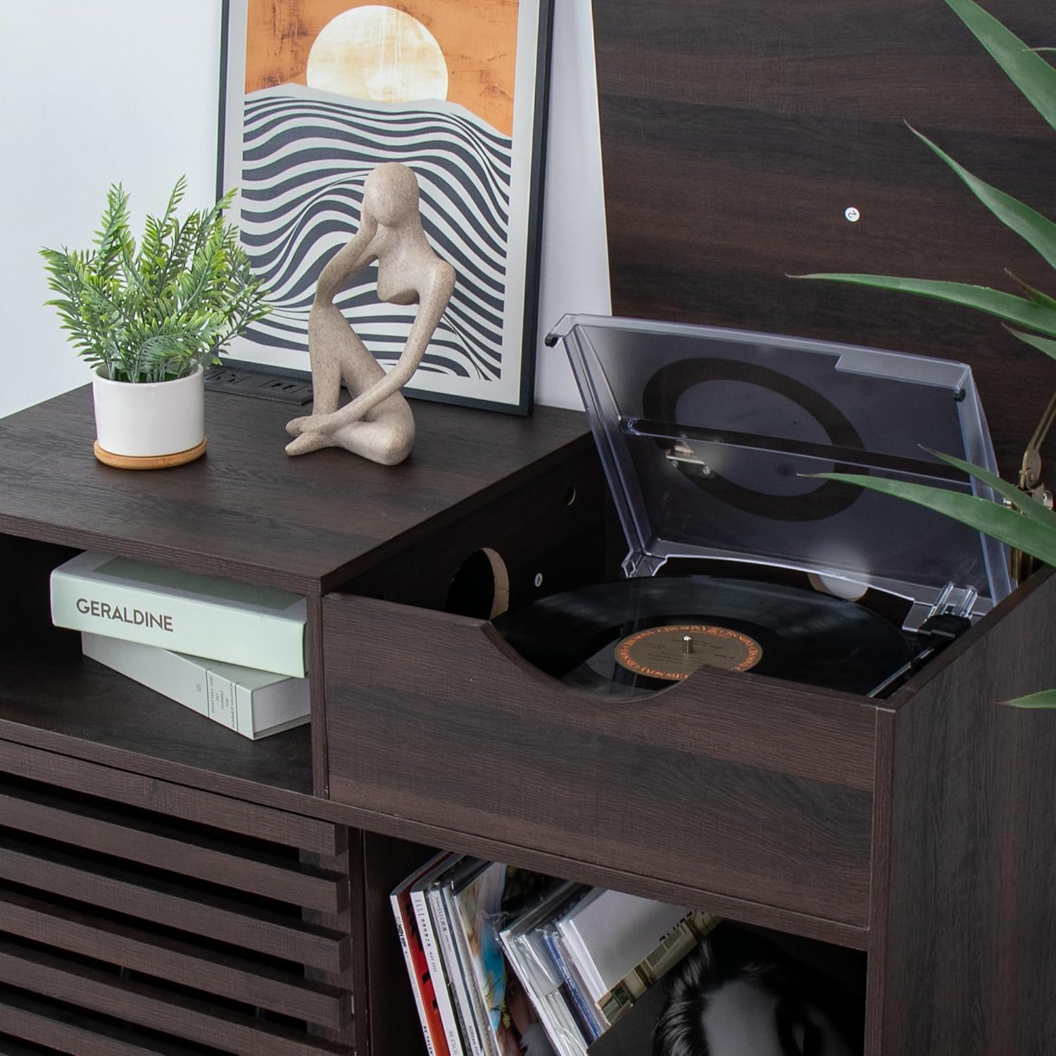 Equipped with a 3-AC power outlet and cable holes for easy connection to your record player, speakers, or other devices — keeping your setup tidy and convenient.Mid-Century Modern Design