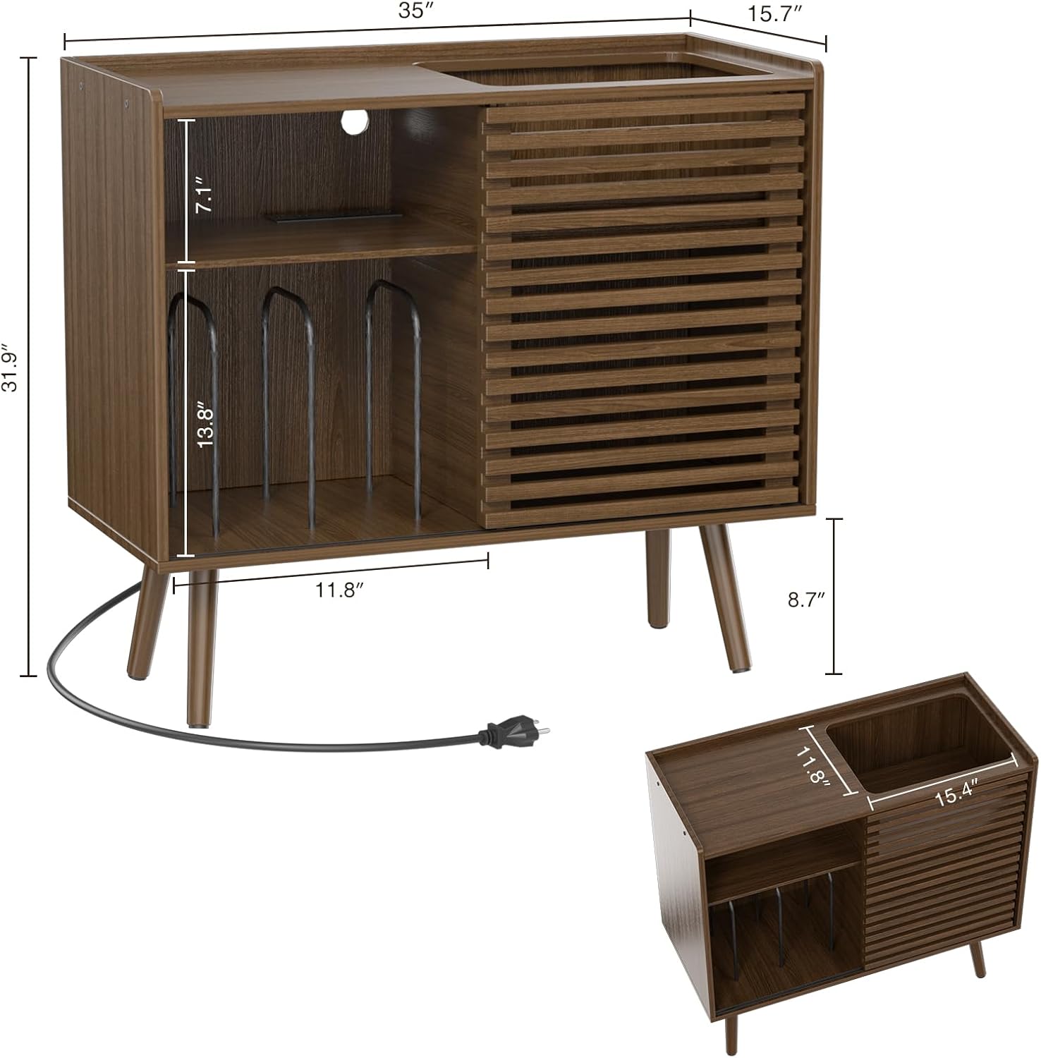 Rustic brown natural wood grain with shutter-style sliding doors adds retro-modern elegance. Enhances your home décor and provides visual enjoyment when playing vinyl records.Built-in Power & USB Outlets