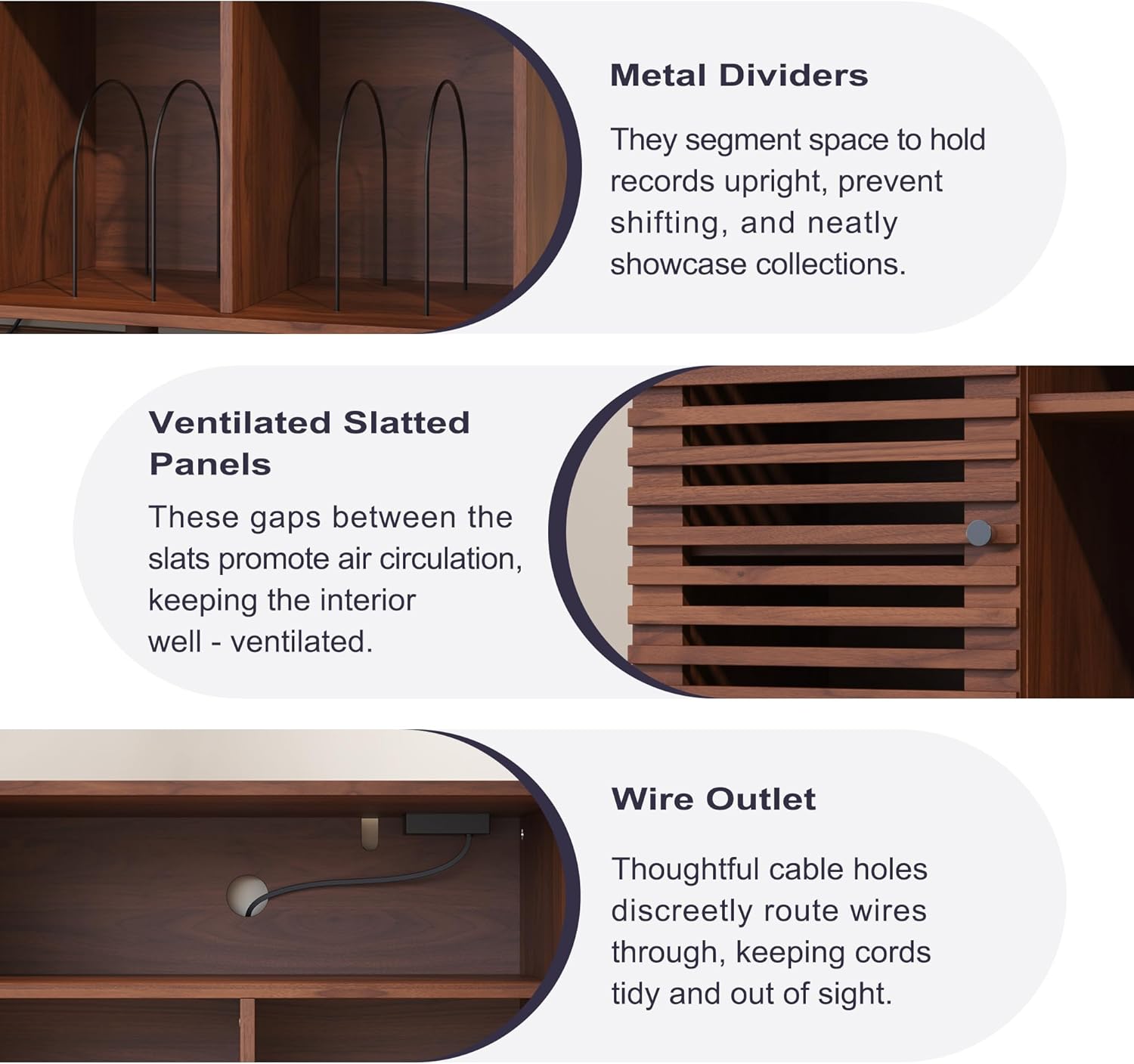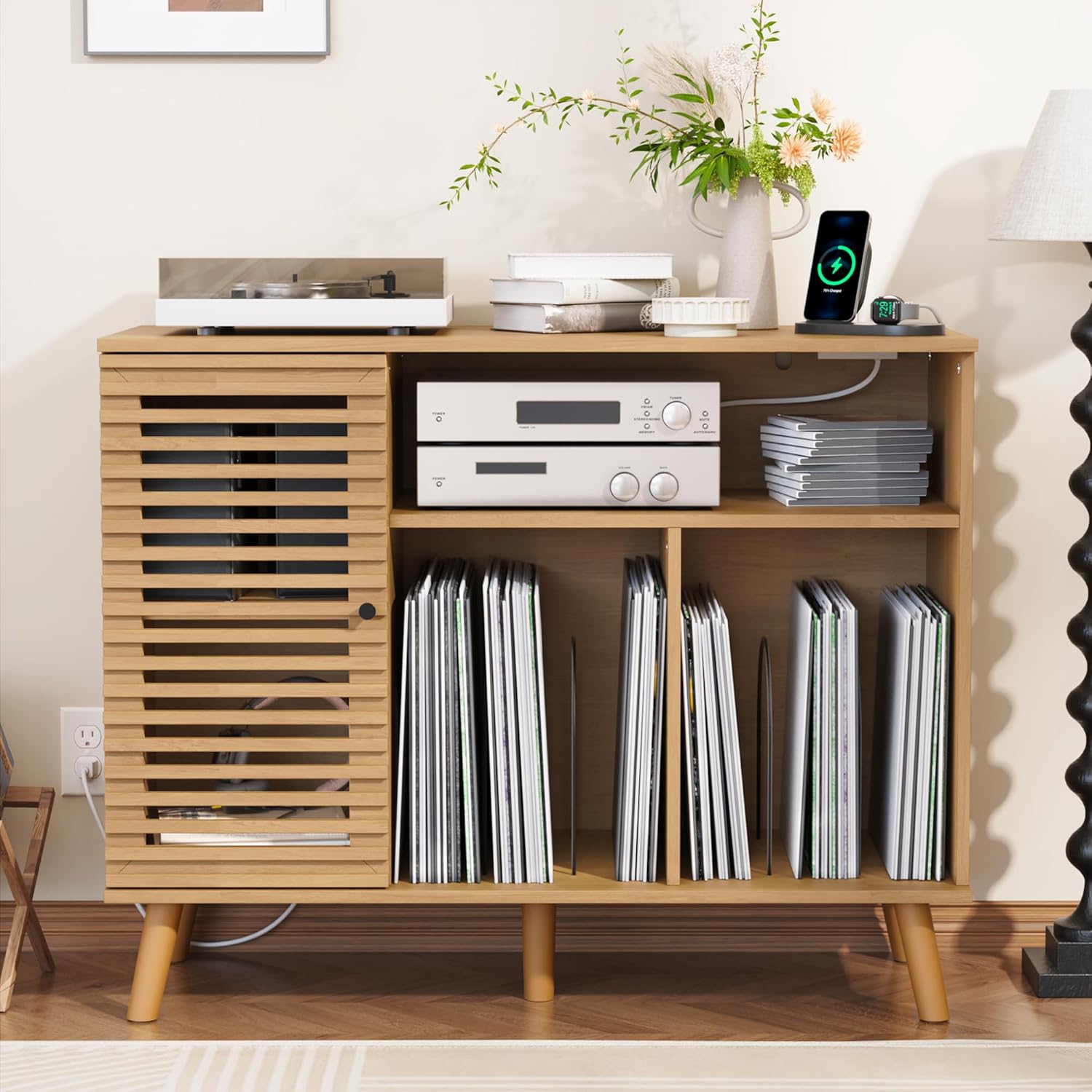 Elevate your music space with this mid-century modern record player stand, combining vintage wood elegance with versatile functionality. Featuring a slatted door, solid wood legs, and adjustable shelving, it provides ample storage for up to 350 media items, including vinyl records, CDs, DVDs, and 7” EPs. Built-in USB ports and standard outlets offer convenient power for your turntable and media devices, while cable management holes keep your setup tidy. Perfect as a turntable stand, vinyl storage cabinet, cube organizer, bookcase, or display cabinet, this stylish piece blends seamlessly with classic or contemporary home décor.