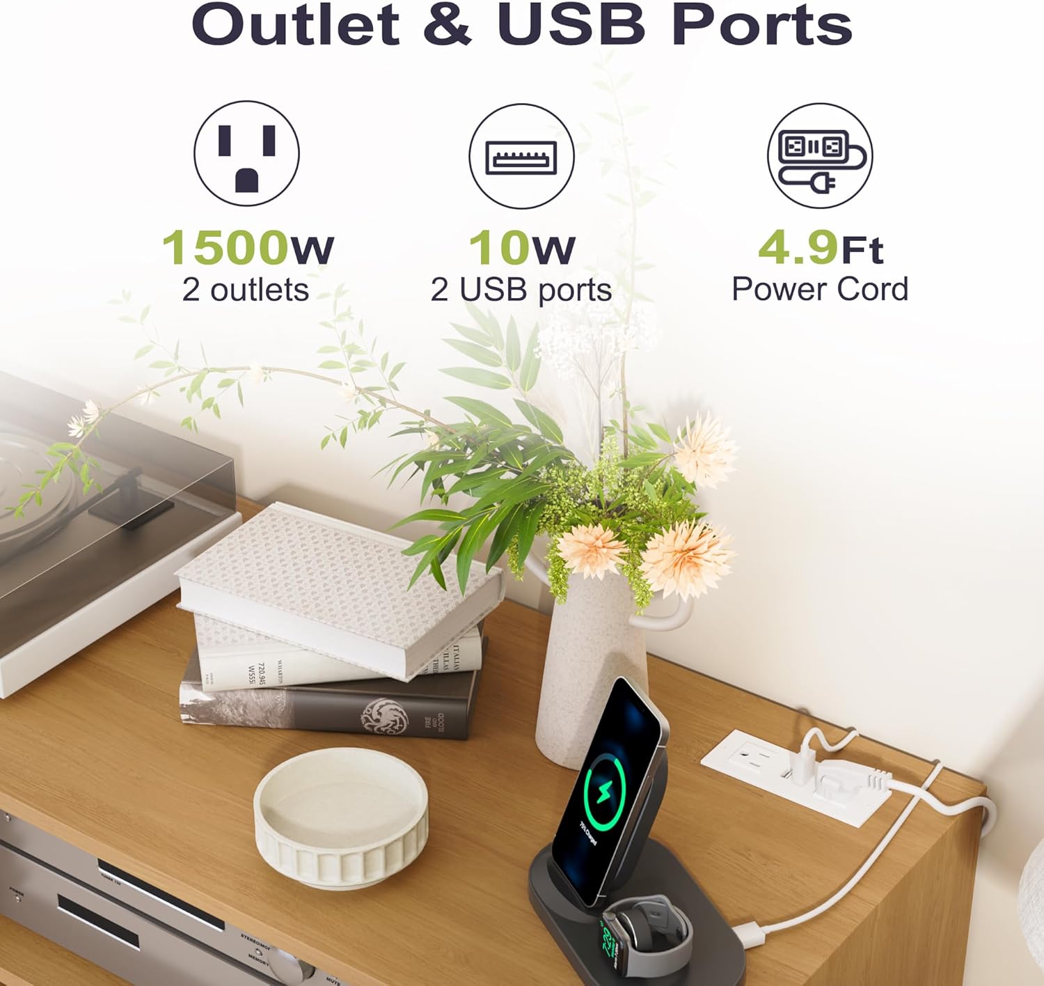 - Power: 2 USB ports + 2 standard outlets