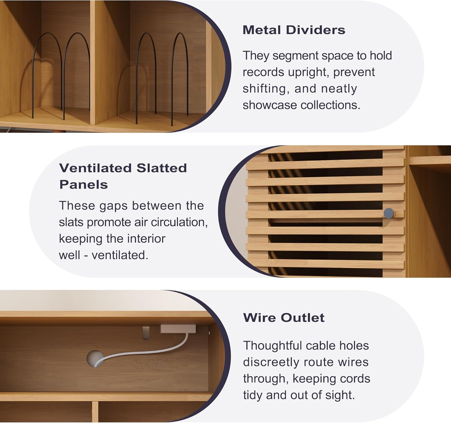- Design: Mid-century modern style, slatted doors, cube and open storage