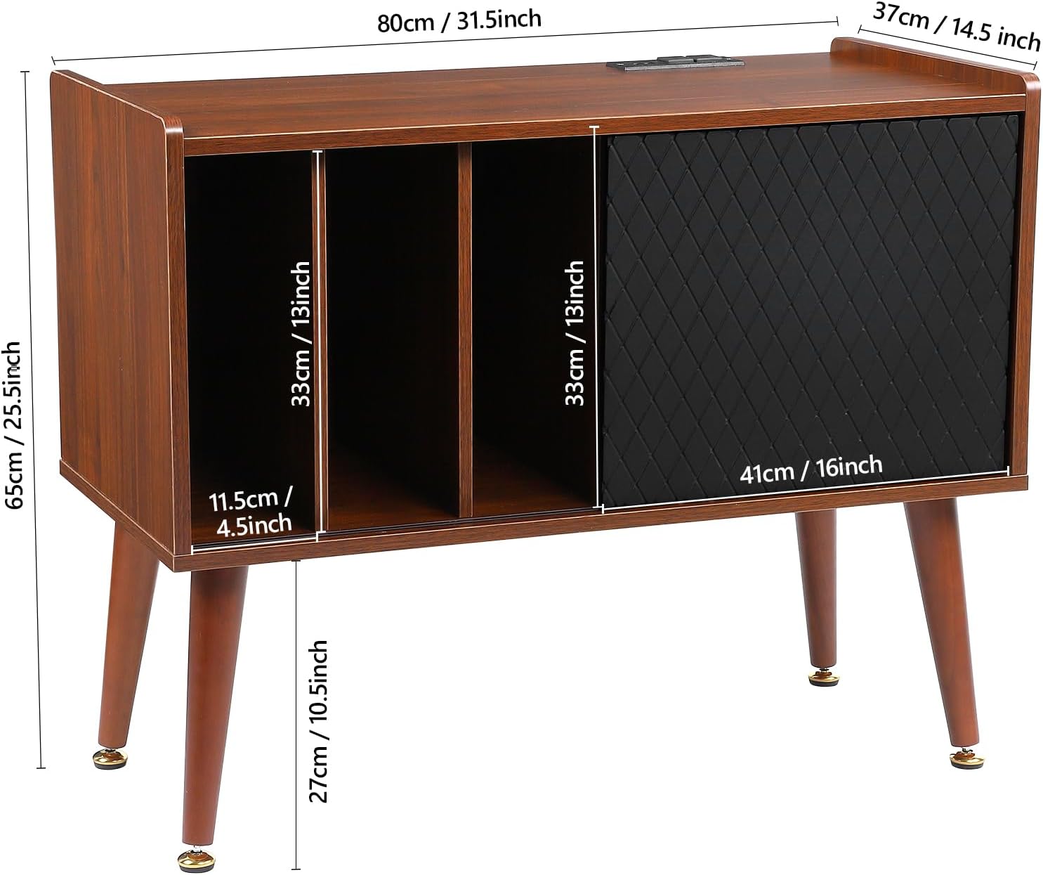 Measuring 31.5" L × 25.5" H × 14.5" W, the cabinet offers 4 storage sections—three smaller compartments and one large area—providing ample room for up to 300 vinyl records. The top surface is sturdy enough to hold your record player securely.Functional and Space-Saving