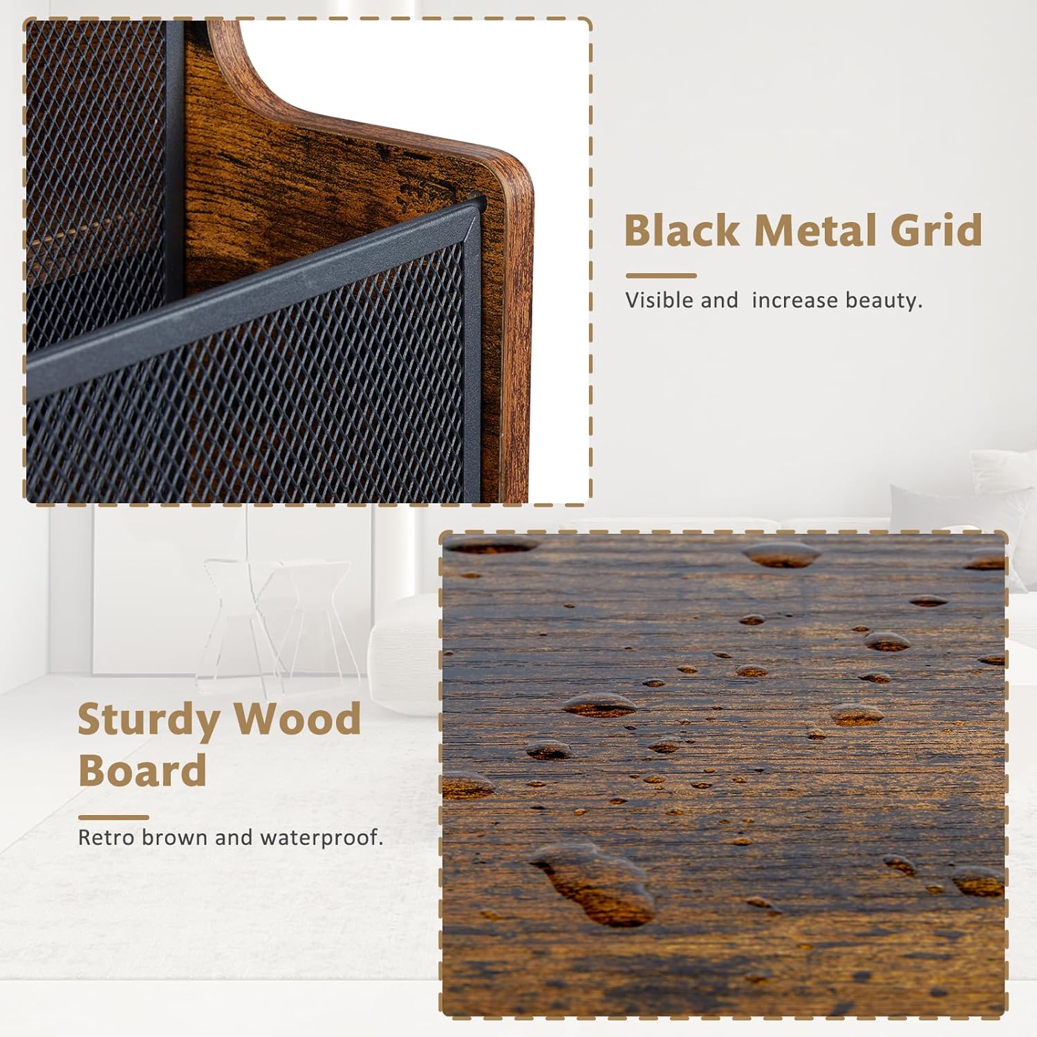 • Finish: Rustic wood texture with black-coated metal