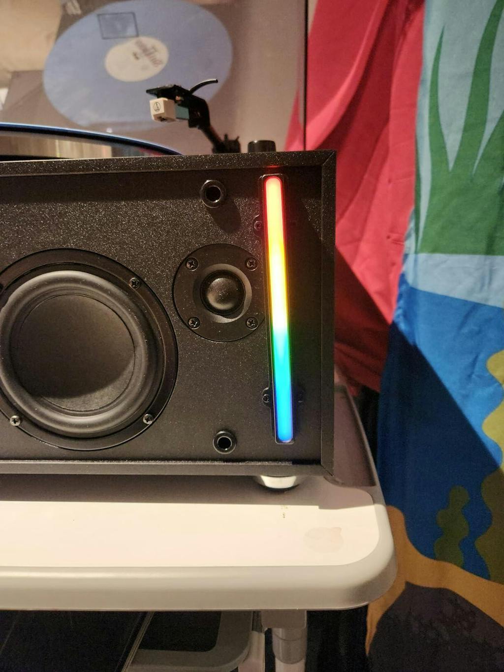 The integrated colored light stripe adds a touch of modern elegance to this sleek record player system, making it a focal point of any home decor.