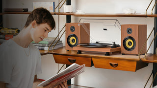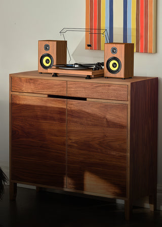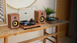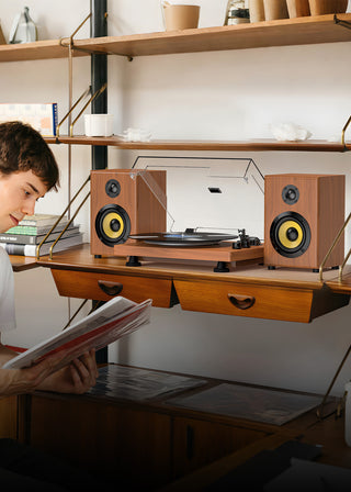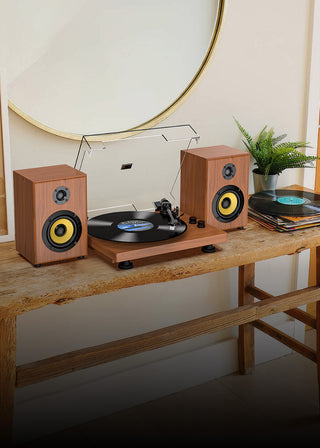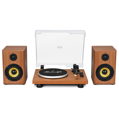 The Retrolife UD016 turntable system blends classic mid-century design with premium stereo sound for a rich, immersive listening experience. Featuring a belt-driven turntable and matching stereo bookshelf speakers, the UD016 delivers warm, detailed vinyl playback with deep bass and crisp highs.