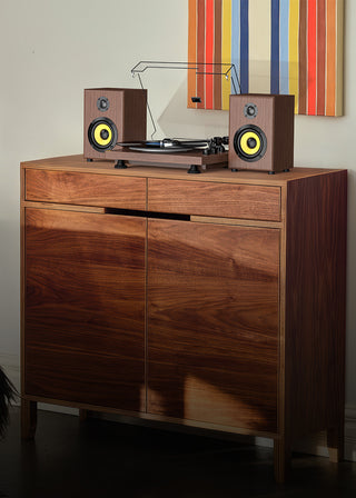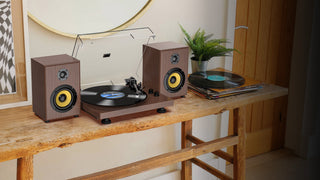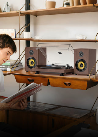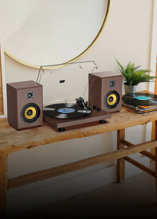 The Retrolife UD016 turntable system blends classic mid-century design with premium stereo sound for a rich, immersive listening experience. Featuring a belt-driven turntable and matching stereo bookshelf speakers, the UD016 delivers warm, detailed vinyl playback with deep bass and crisp highs.